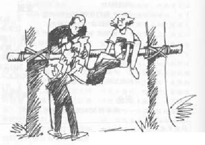 准备:游戏开始之前,把横杆牢牢绑在两颗树上,距地大约2.4米。务必保证栏杆牢固结实,因为在游戏中它需要同时承担三个人以上的重量。