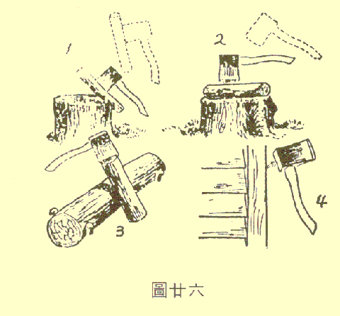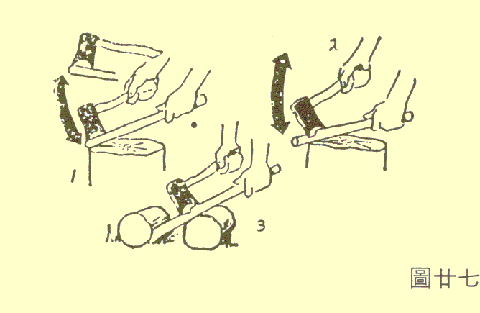 (一)小中斧劈材:左手持材,右手持斧,连材带斧一齐上下劈它(见图二六)和(图二七之1),这是最安全稳当的方法。左手持材右手持斧,持材之手不动,只挥斧上下劈它(见图二六)和(图二七之2),这是比较快捷,但需熟练的人才可,不然是太危险了。直劈如(图二六之3),横断如(图二七之3),均须找好垫子,请看图片自然明白。斧背也可当锤子用,钉小钉子等,见(图二四之4),不宜当锤子做粗重的工作,以免影响斧头松脱容易伤人。