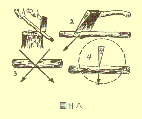 分段应该在粗木的当中下斧,左一斧、右一斧劈成交叉形(见图二八之3),千万不可直下斧(见图二八之4)。