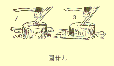 (二)粗枝削齐分段:段枝削齐的方法,见(图二八之1、2),要找好垫板才好下斧,凡用斧先要有垫子,其次所有下斧处都是斜四十五度角才能保持斧锋的锋利。