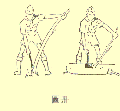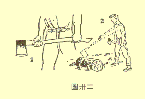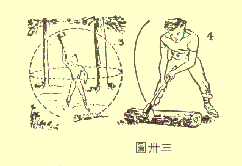 (四)大斧使用的步骤:首先左、右手把大斧持好,两边都留有两、三寸余地(见图三二之1),第二步先将大木头用垫子稳定妥当,再将斧伸长至木头处取得距离(见图三二之2),第三步先斧头左右横绕一圈,再上下直绕一圈,免得用力时碰到东西危险(见图三三之3),一切妥当准备好就下斧猛力挥劈去(见图三三之4),那就事半功倍,很快地把木头劈断。