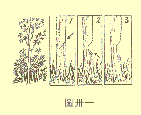 (三)倒树:用斧倒大树应分三个步骤,先在近树根约三、四尺之间从上劈下,见(图三一之1),跟着从下向上劈之,深度约该树的五分之三(见图三一之2),继续从下向上劈它见(图三一之3),保持深度,到了失重心劈它自然会倒下,但千万要小心,树初倒时没有经验,最好用绳子牵着,到时先跑开,拉绳子树就倒了。这比较安全。