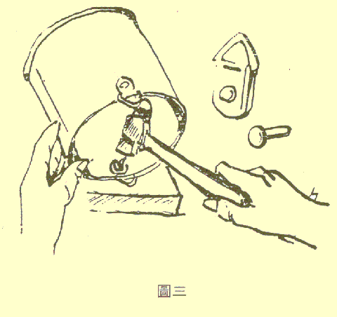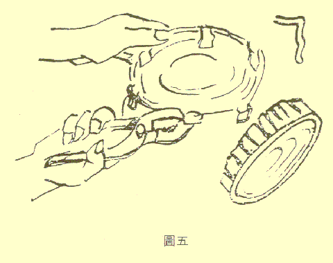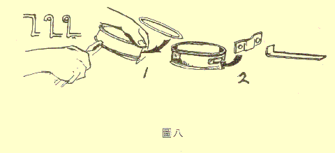 子,加上一条铁线向里面卷入去,再加上一个叩耳,以便将把柄叩着,就是一个煎盘了,留心看(图八)之1和2便清楚。