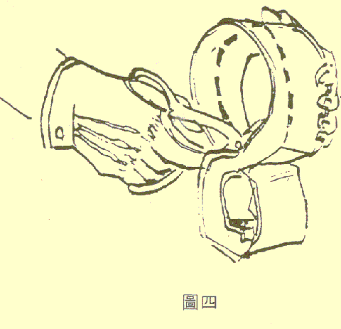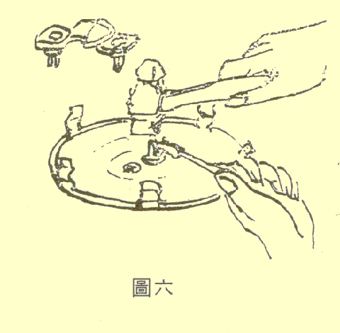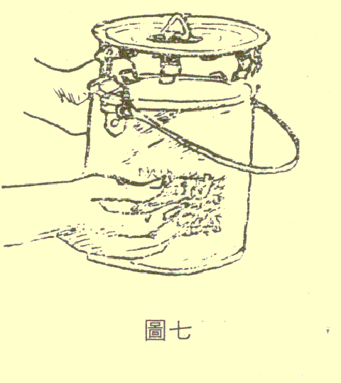 主要的要做饭锅、汤锅和煎盘等,先用锅钉和铁线在罐口上面两边做两个耳环(见图三),再将另一罐子的铁片剪下(见图四),铁片留作其它(如做耳环或把柄等)用途,在最后剩下约一寸左右将他剪开,除留下六个用钳子将之做成曲弹状(见图五)外,把其余的剪掉了,这就是不易脱落的锅盖子,再在中央加做一个耳环(见图六)便是很好的盖子了,然后用铁线连串在两边的耳环上,就成为把手,请细看(图七)便可了解。